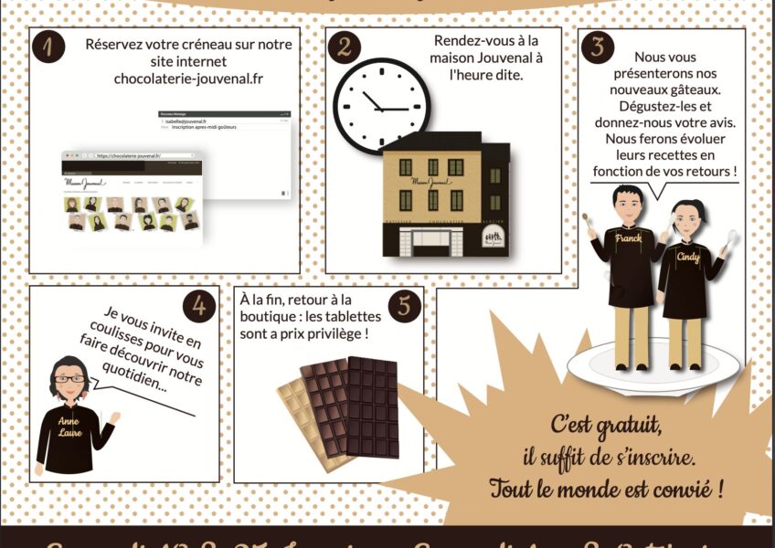 Vous allez aussi (re)découvrir nos laboratoires de chocolaterie où Anne-Laure vous reçoit chaque année pour vous parler des coulisses de notre entreprise. Pendant ces après-midis, les plus gourmands pourront acheter des tablettes de chocolat à prix préférentiel.