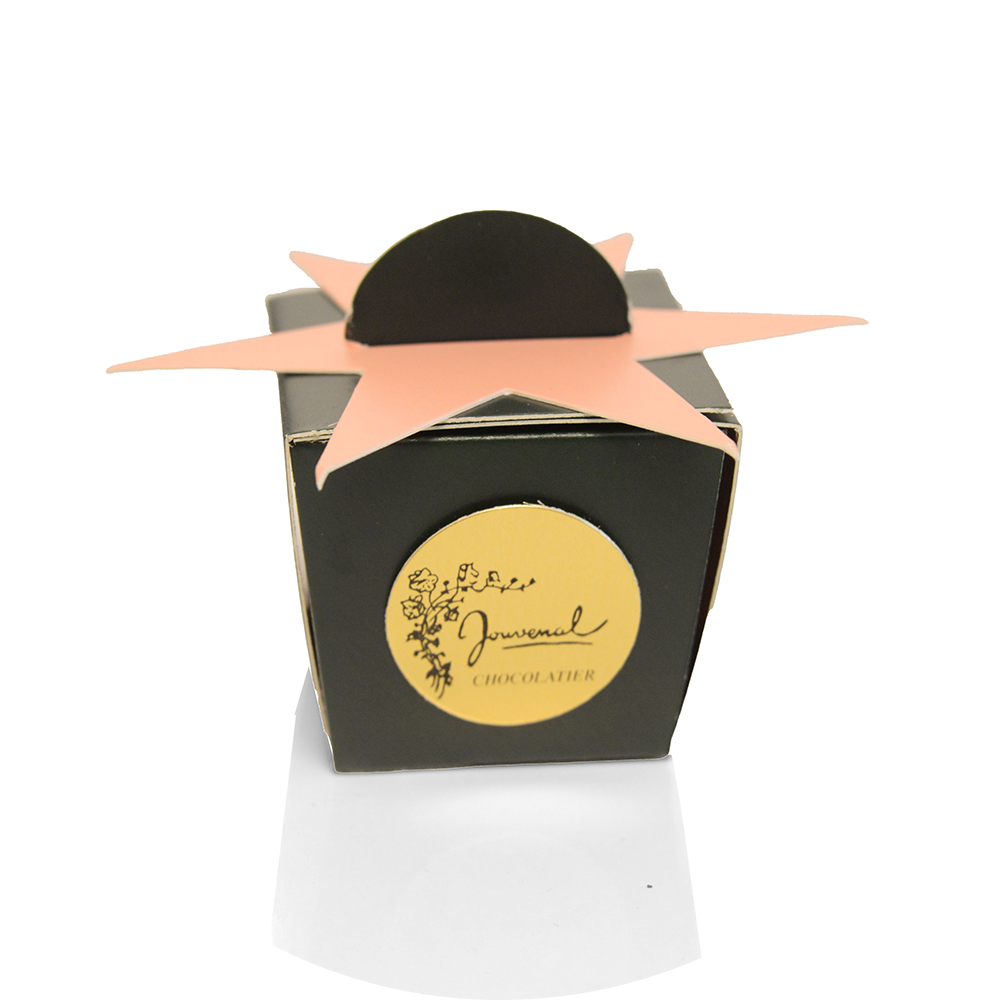 Damnation : Chocolat noir (pâte de cacao72%, sucre, beurre de cacao, lécithine de soja, arôme naturel de vanille), praliné aux noix (noix, noisettes, caramel), feuilletine (farine de blé, lait, beurre, sucre), chocolat au lait (pâte de cacao 38%, sucre, poudre de lait entier et écrémé, lécithine de soja, arôme naturel de vanille, gousses de vanille broyées beurre de cacao), colorant tampon oxyde de fer.
