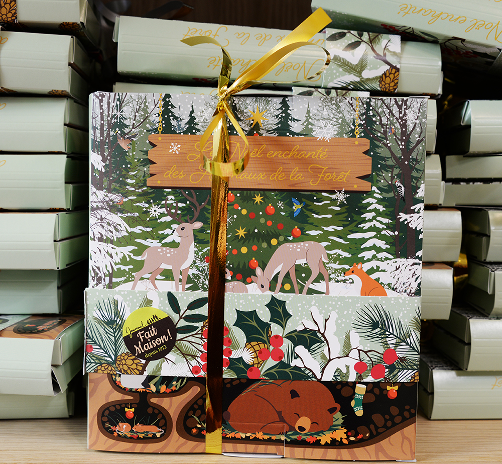 Ingrédients : Chocolat noir (pâte de cacao, sucre, beurre de cacao, lécithine de soja, arôme naturel de vanille), chocolat blanc (Sucre, beurre de cacao, lait entier en poudre, lait écrémé en poudre, lécithine de soja, arôme naturel de vanille), chocolat au Lait (Sucre, beurre de cacao, lait entier en poudre, lait écrémé en poudre, pâte de cacao, sirop de glucose caramélisé, lécithine de soja, arôme naturel de vanille, gousses de vanille broyées).