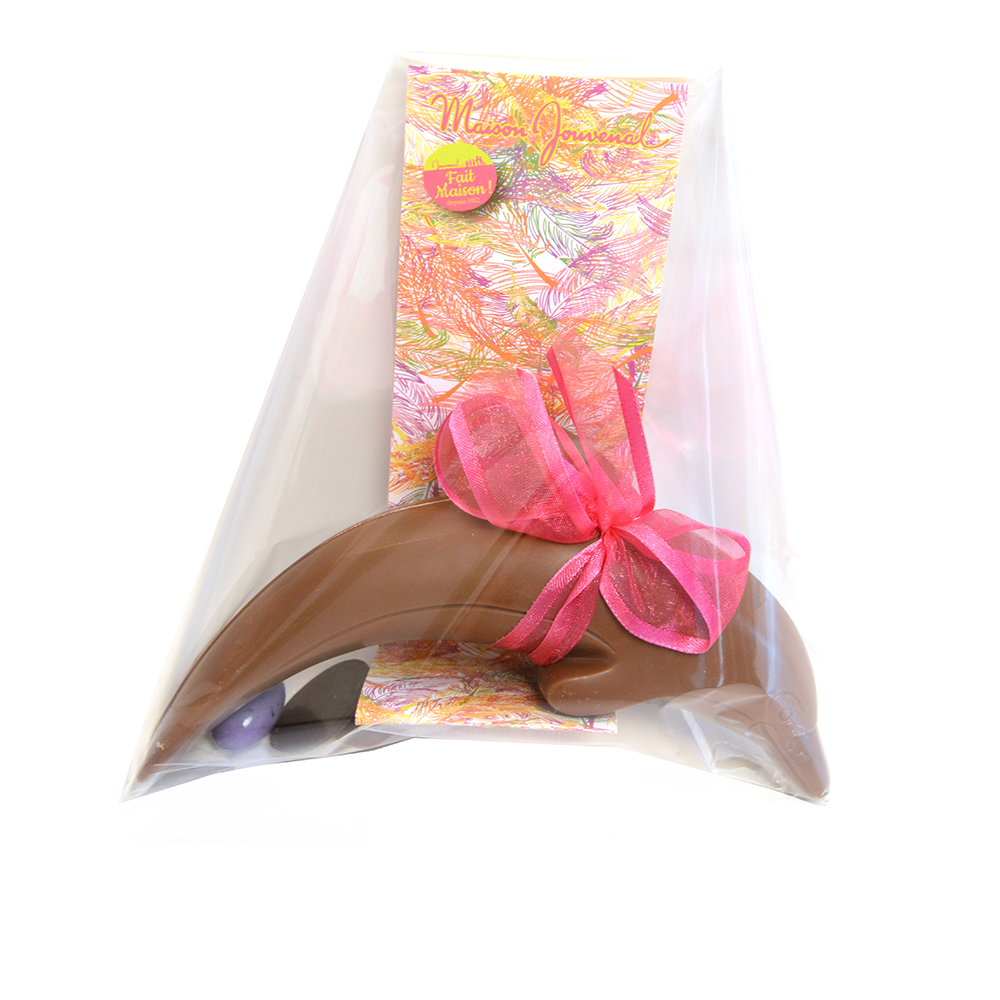 Chaque moulage est garni avec de la friture de sa couleur (ex : un dauphin en chocolat noir est garni de fritures au chocolat noir).