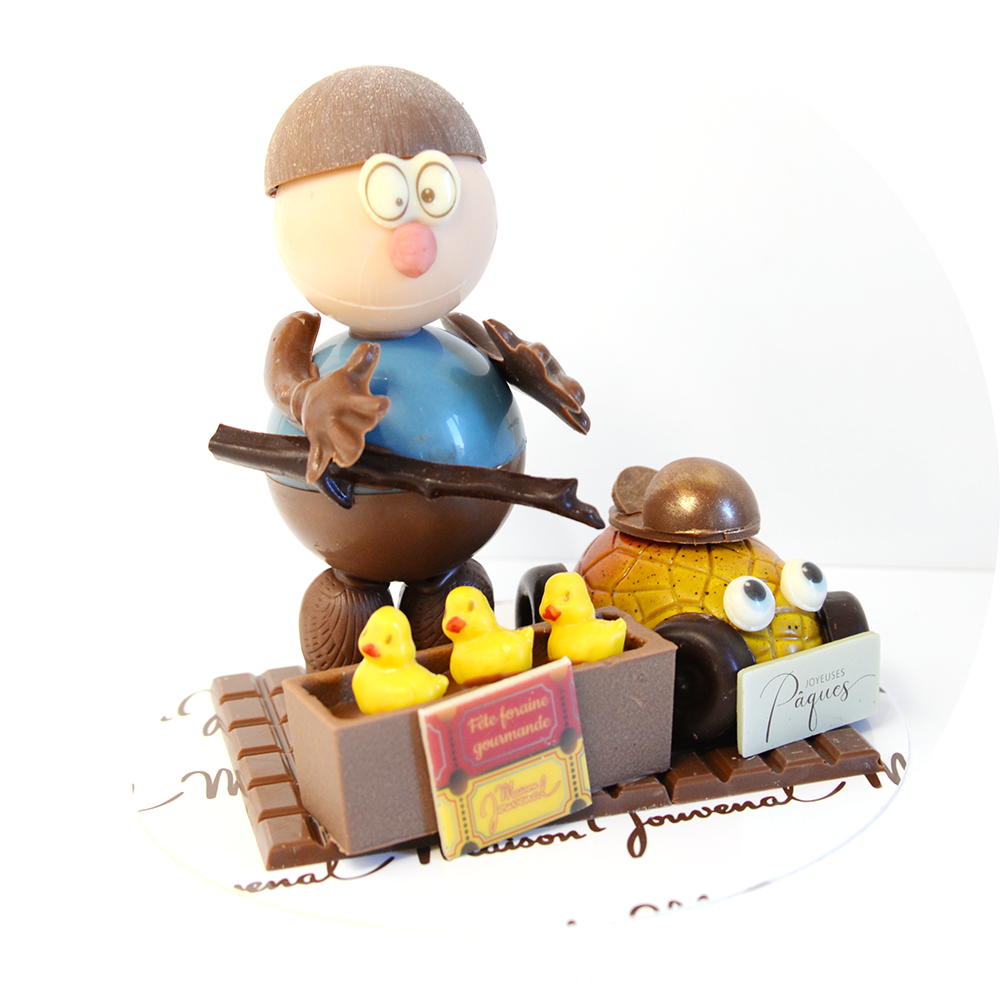 Les chocolatières vous ont préparé de magnifiques sujets de Pâques en forme de voitures de manège, de pêche à la ligne, de balancelle de grande roue…