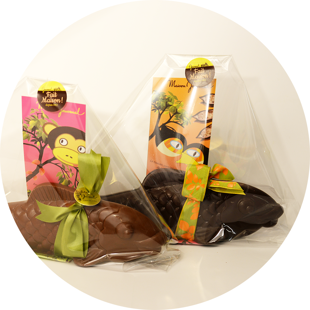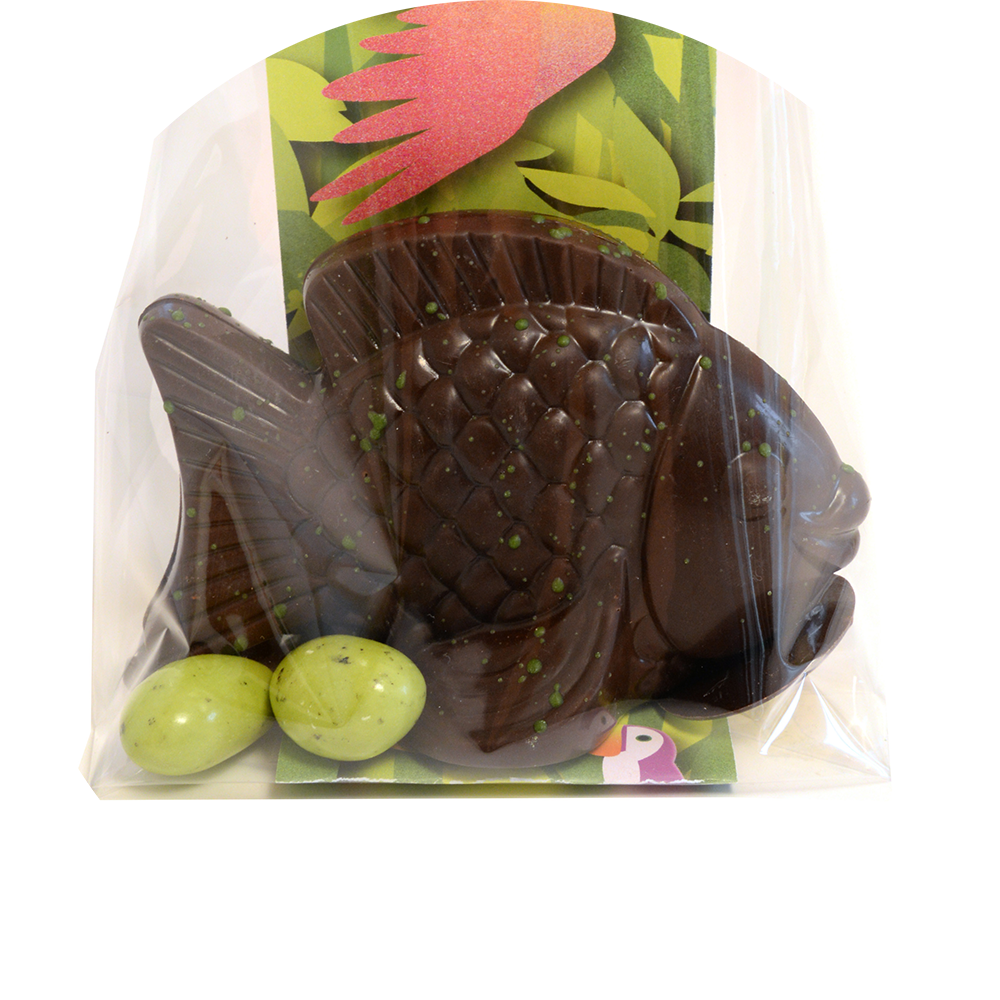 Chaque moulage est garni avec de la friture de sa couleur (ex : un poisson en chocolat noir est garni de fritures au chocolat noir).
