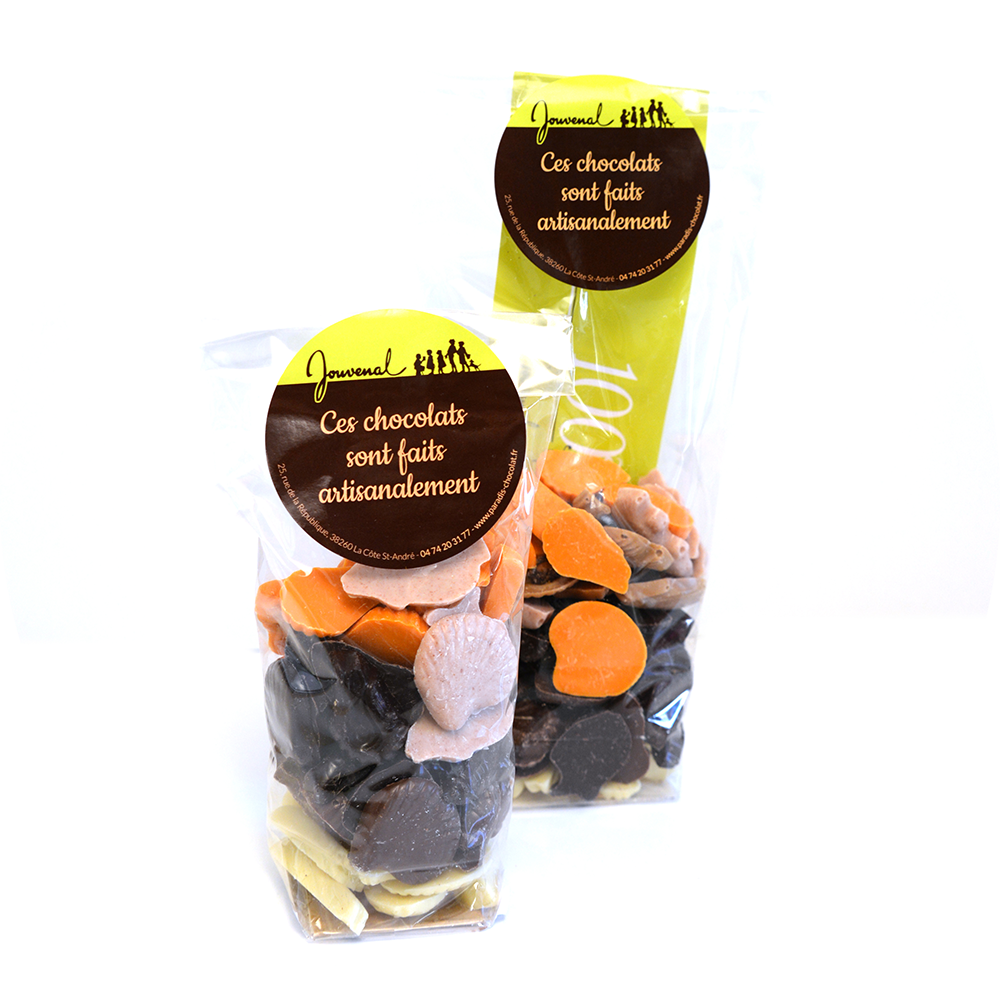 Sac de de friture aux 6 parfums : chocolat noir à 72%, chocolat au lait, chocolat blanc, chocolat blanc au caramel et à la noisette à la cantonnaise, chocolat à l’orange et chocolat à la barbe à papa.