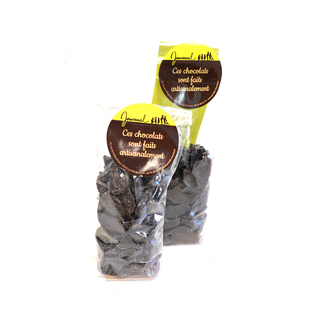 Ingrédients : Chocolat noir à 72% (pâte de cacao, sucre, beurre de cacao, lécithine de soja, arôme naturel de vanille).